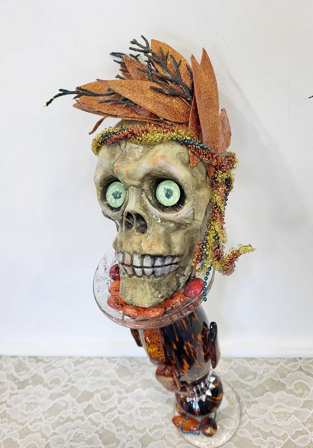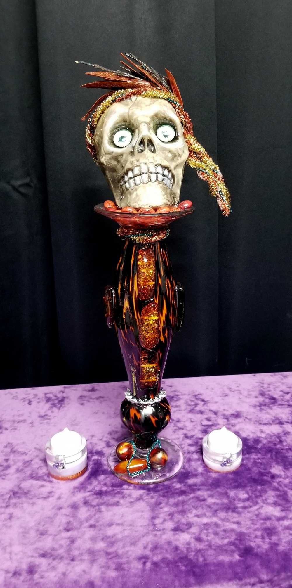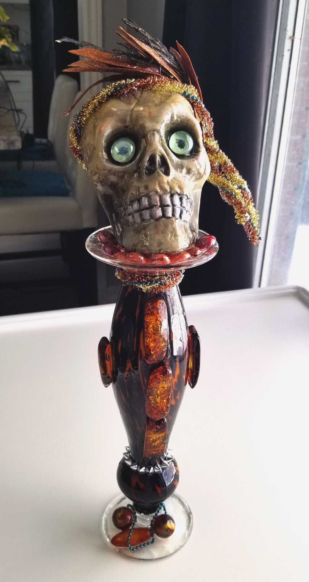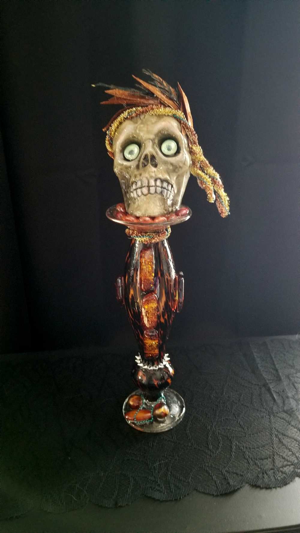 Get wild with this stately and stunning Ellegant Tiger Glass Skull featuring rich black and orange colors, decked out with Silver Studs and Large Amber Beads. Her gold and copper headdress sports a funky teal headband adorned with black sticks and glittery copper leaves. Keep an eye out for her piercing green glass gaze. As if that wasn't enough, the skull also rocks a string of amber beads down her bod and a layer of silver studs at the base. And let's not forget the two large round beads, an oblong bead, and a string of teal beads that add that extra dose of flair. To top it all off, the entire piece is coated in clear resin for a dazzling shine.