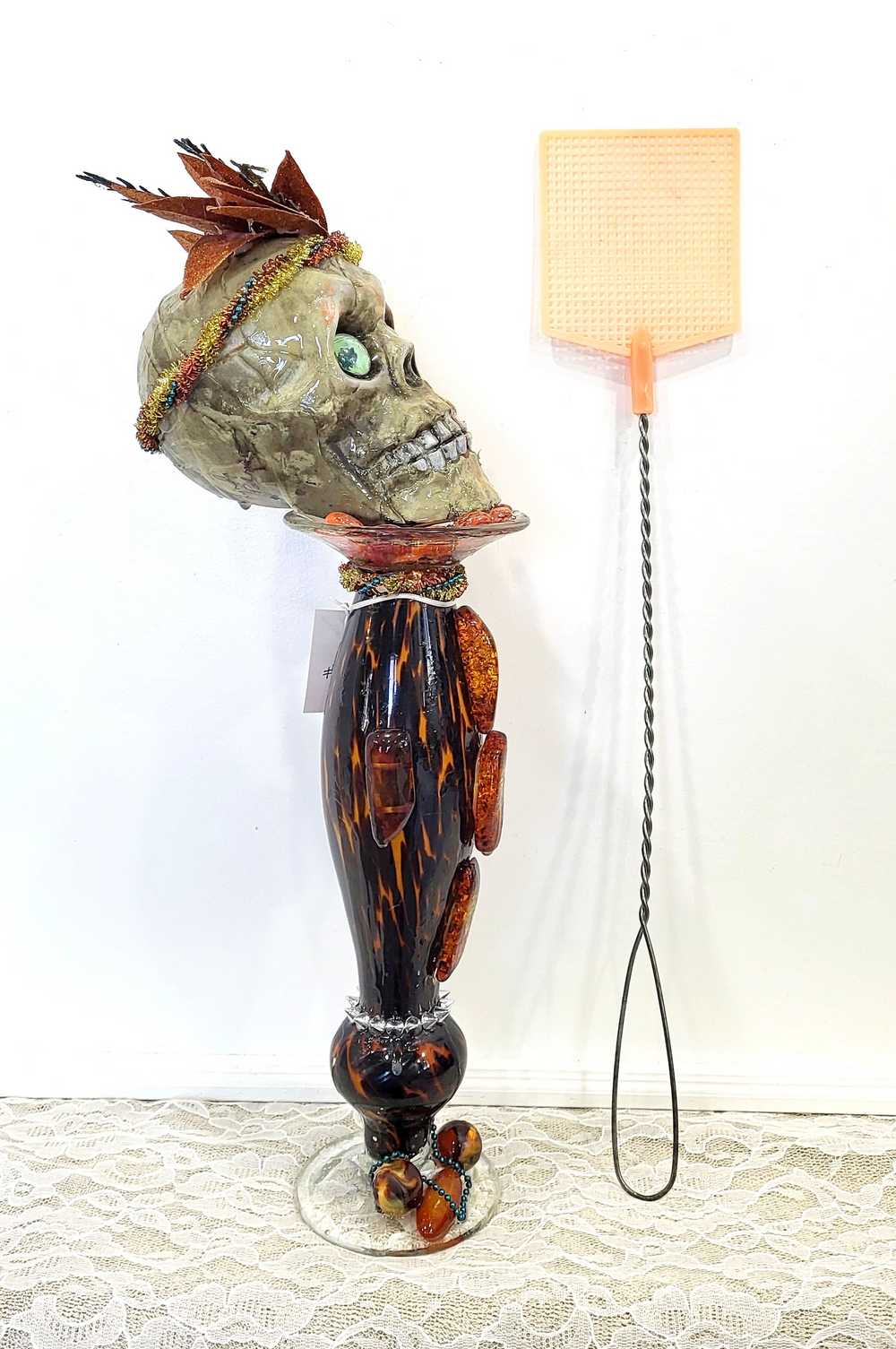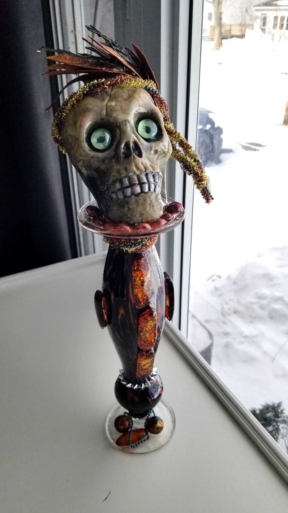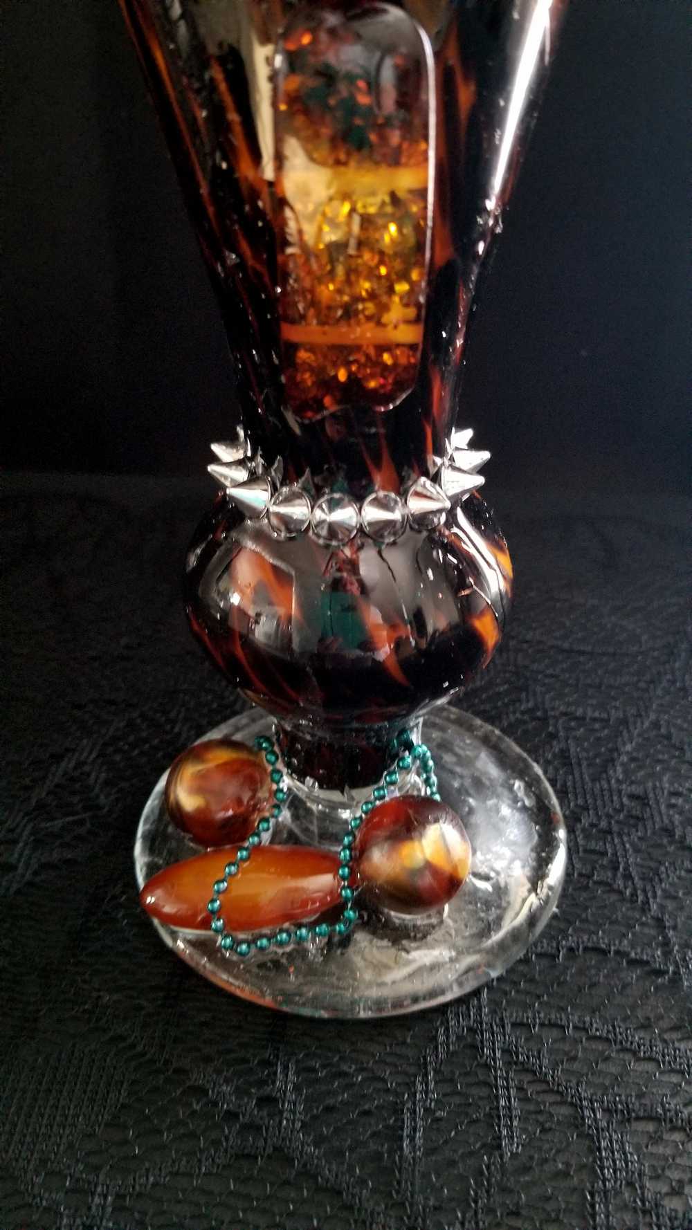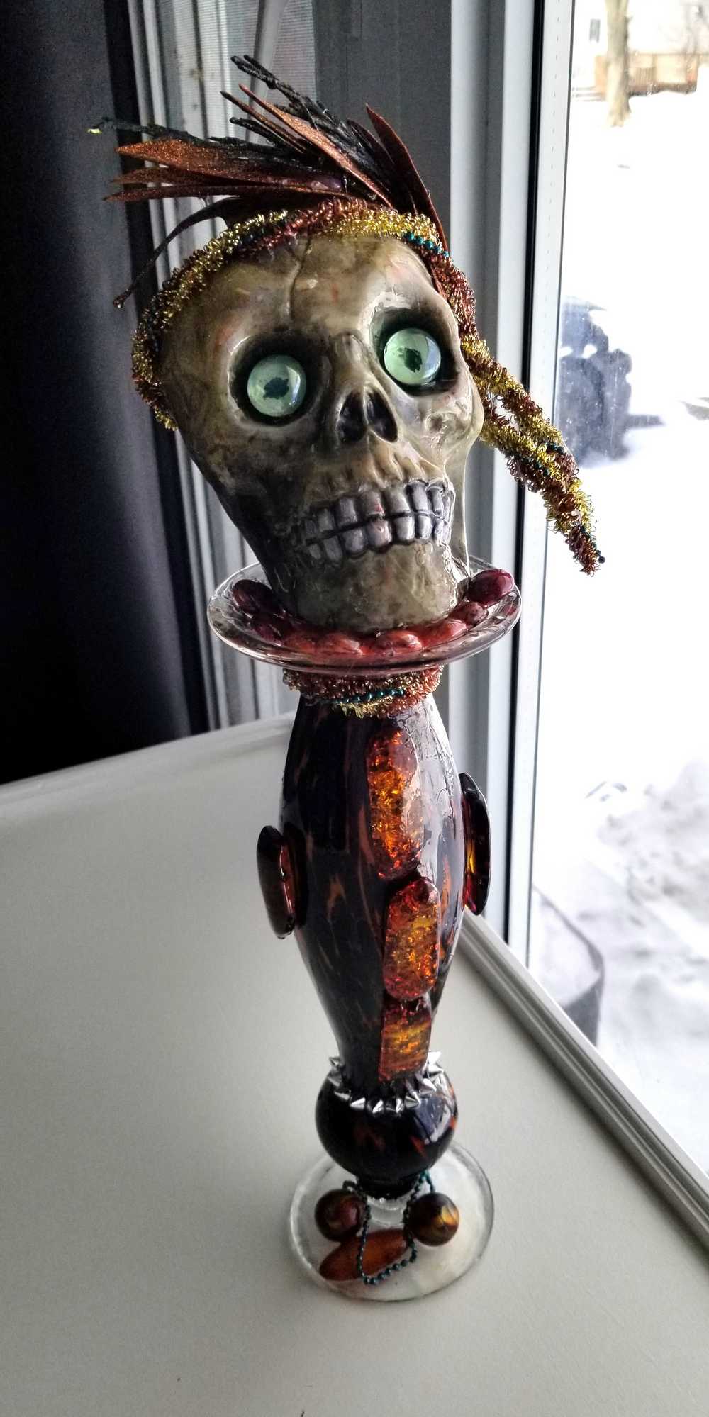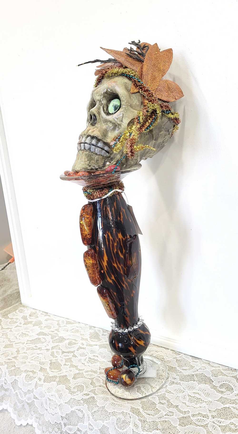 Get wild with this stately and stunning Ellegant Tiger Glass Skull featuring rich black and orange colors, decked out with Silver Studs and Large Amber Beads. Her gold and copper headdress sports a funky teal headband adorned with black sticks and glittery copper leaves. Keep an eye out for her piercing green glass gaze. As if that wasn't enough, the skull also rocks a string of amber beads down her bod and a layer of silver studs at the base. And let's not forget the two large round beads, an oblong bead, and a string of teal beads that add that extra dose of flair. To top it all off, the entire piece is coated in clear resin for a dazzling shine.