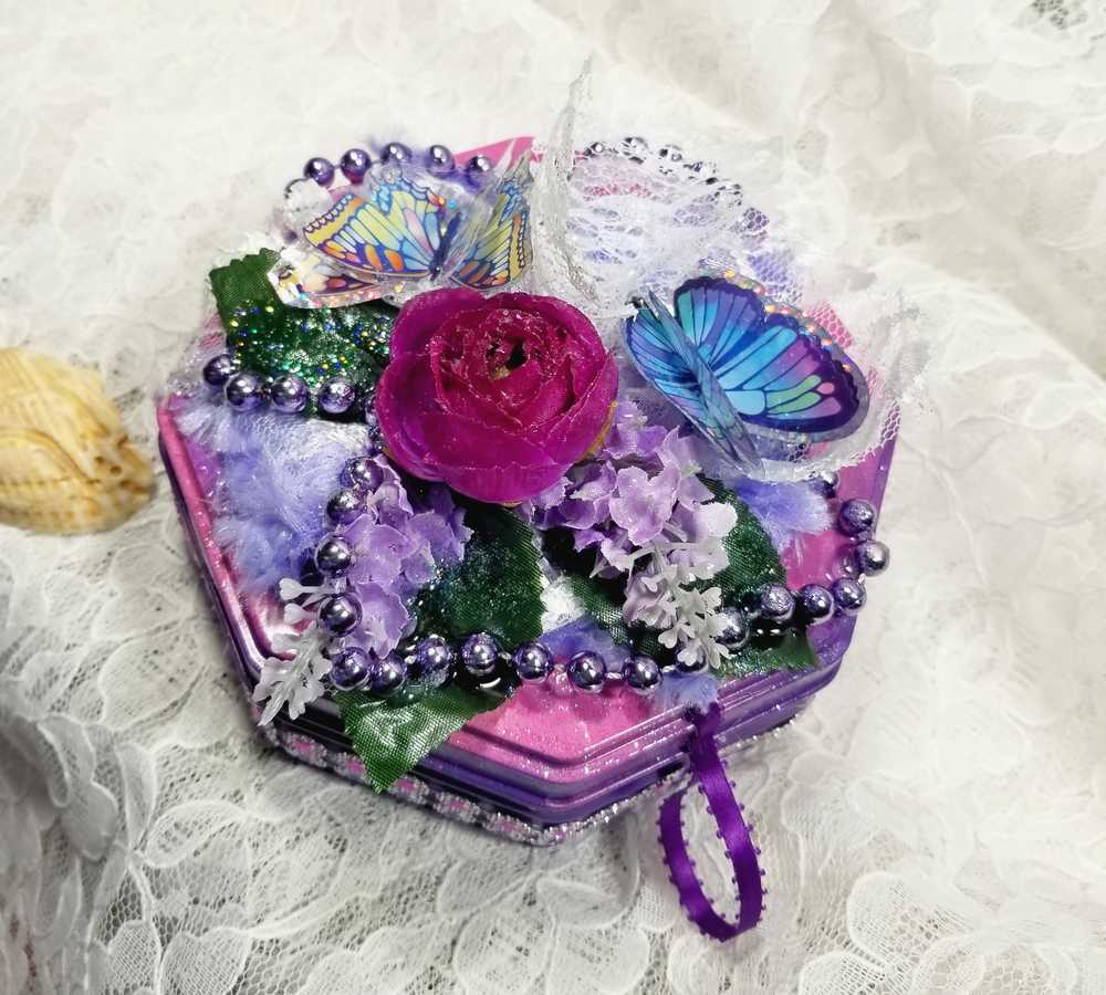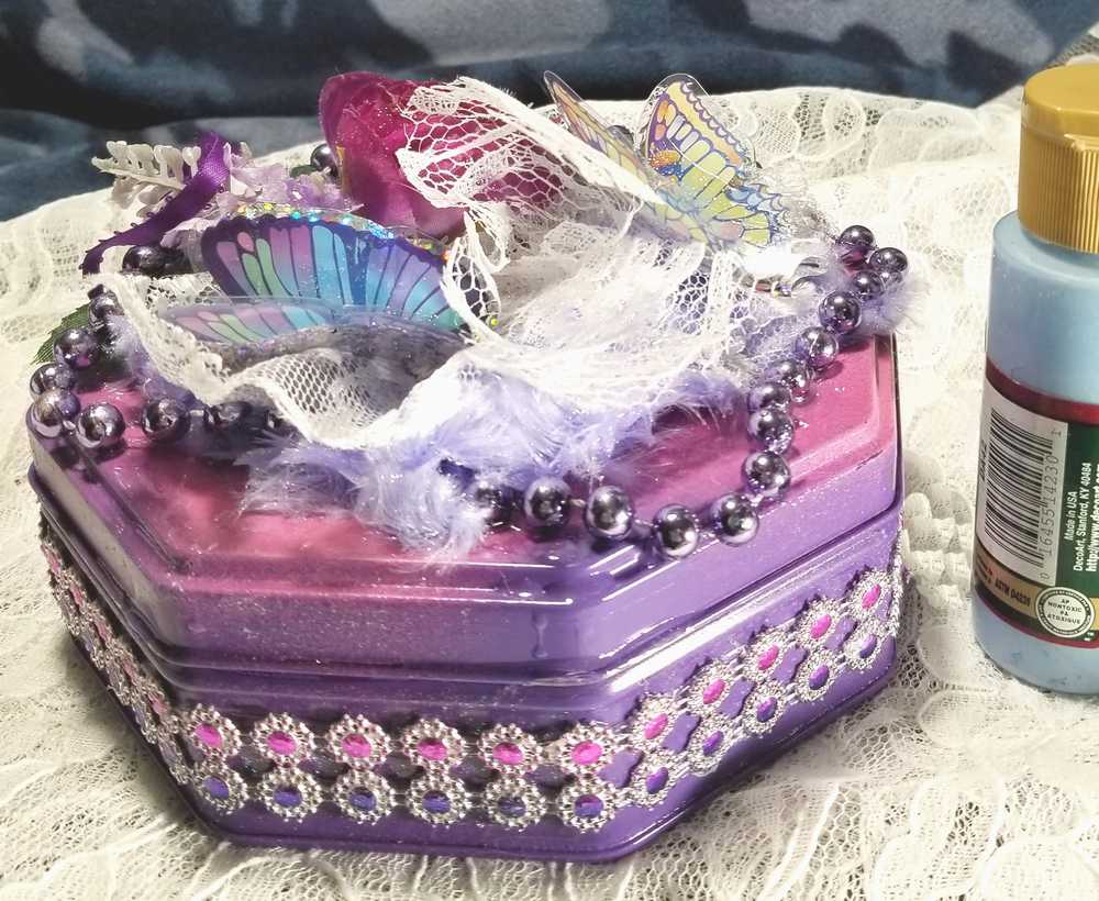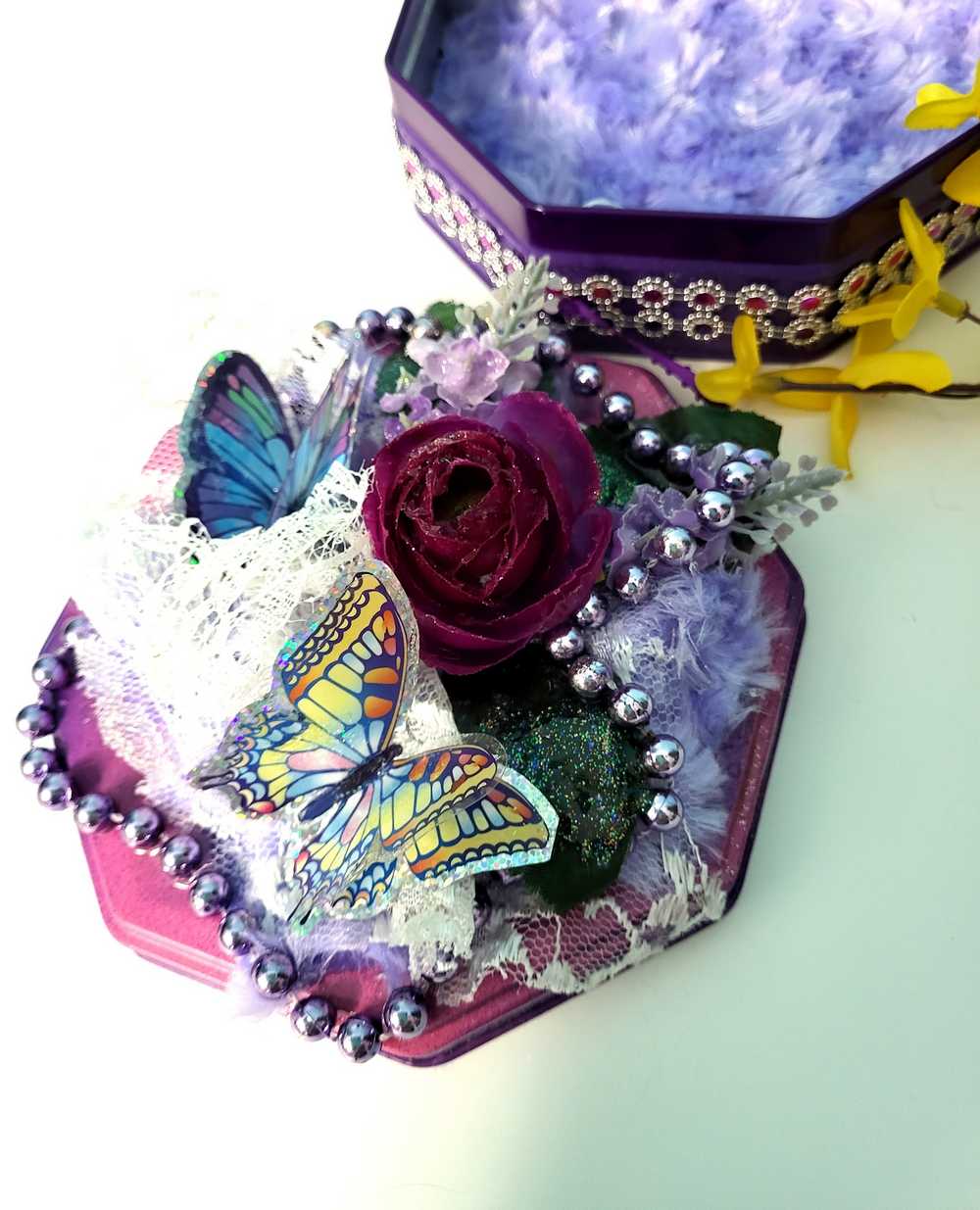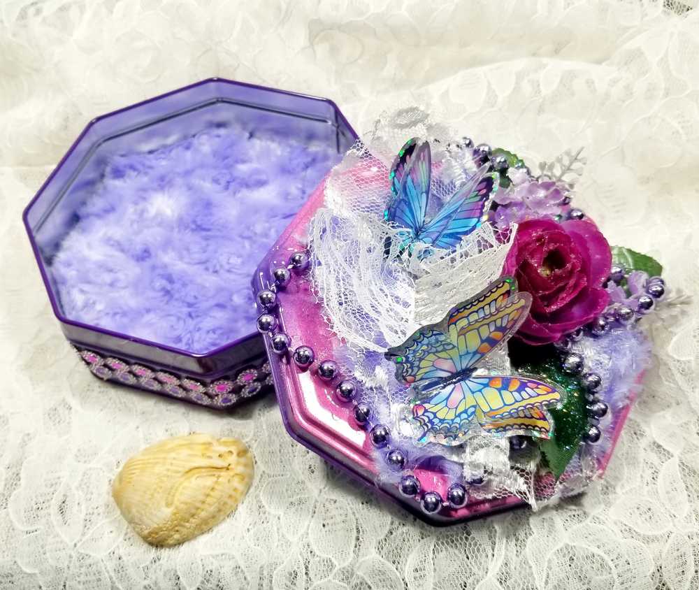 Tin Box Repurposed into a Jewelry Box, Two Butterflies and Deep Purple Rose on Lace