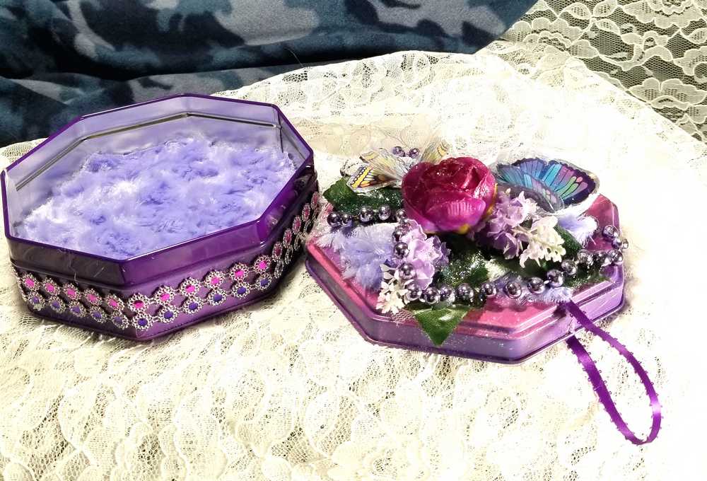 - Octagon Shaped Tin Box, Repainted Pink & Purple with Pretty Ribbon Stones around it