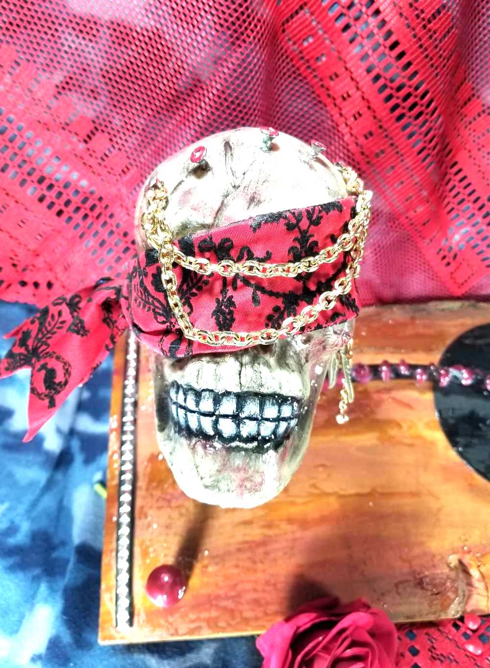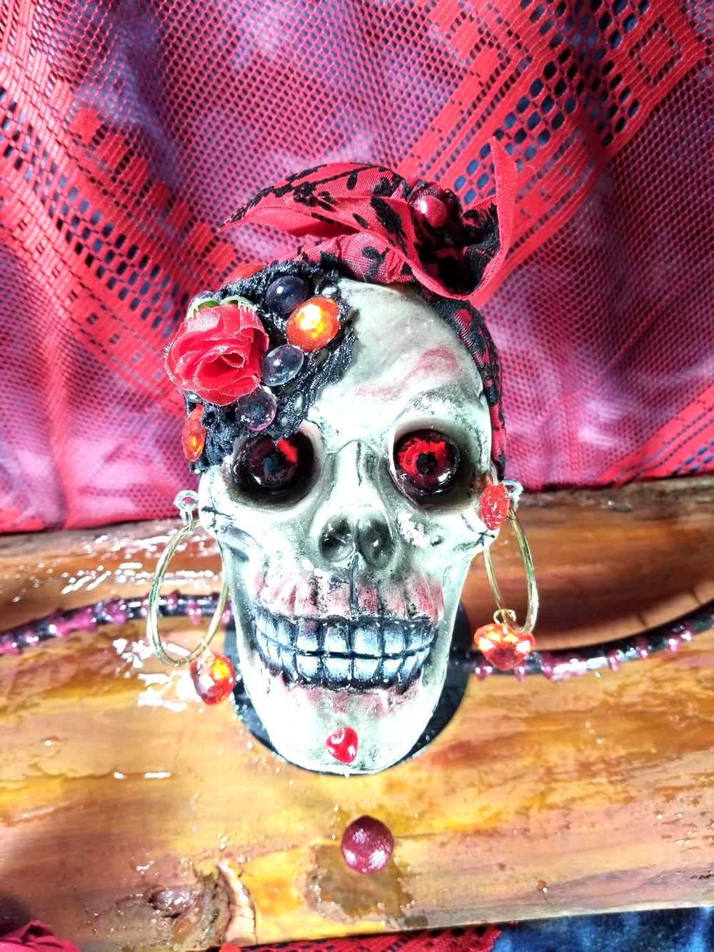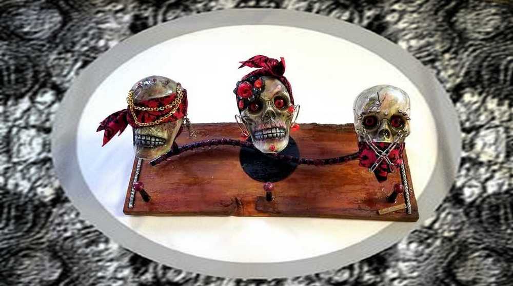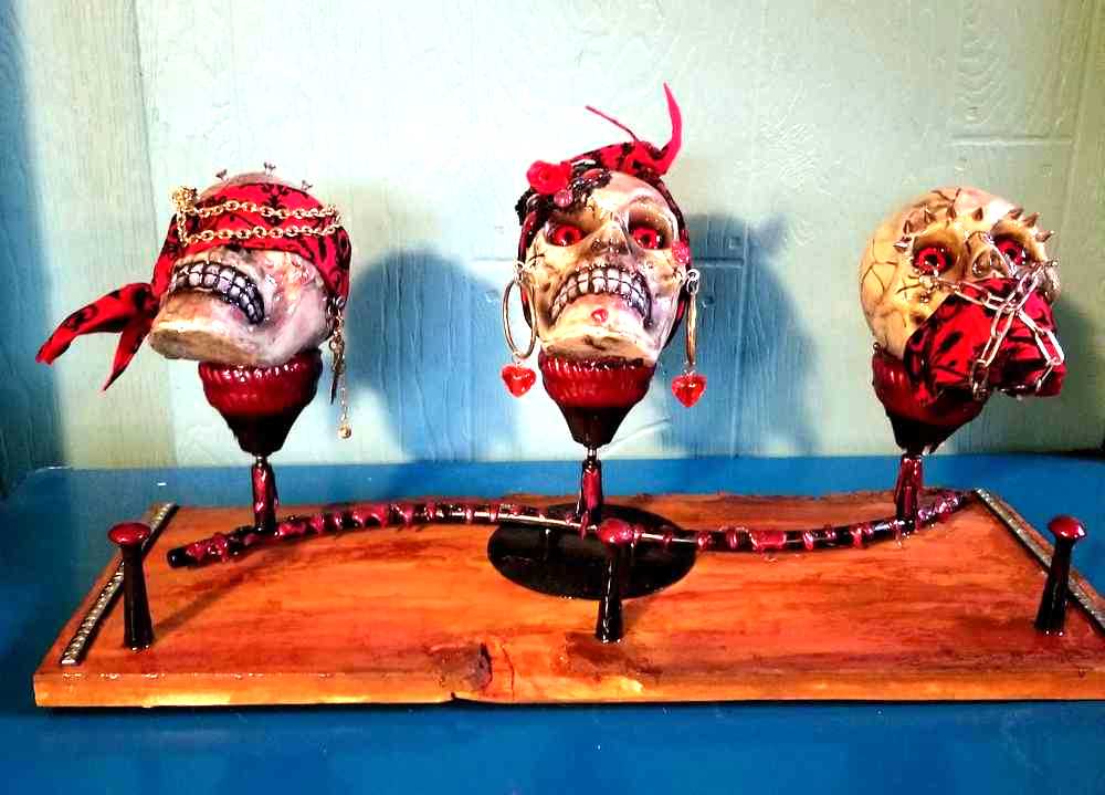 - I am Very Proud of this Original Design. I Had a Blast Designing these Beauties. I Recycle an old light by removing all the guts, and attaching it to an old plank from a home torn down. I decorated three Plastic Skull Heads with Red and Black Velour Fabric, The plank has some dings and dents but this only adds to its Charm.