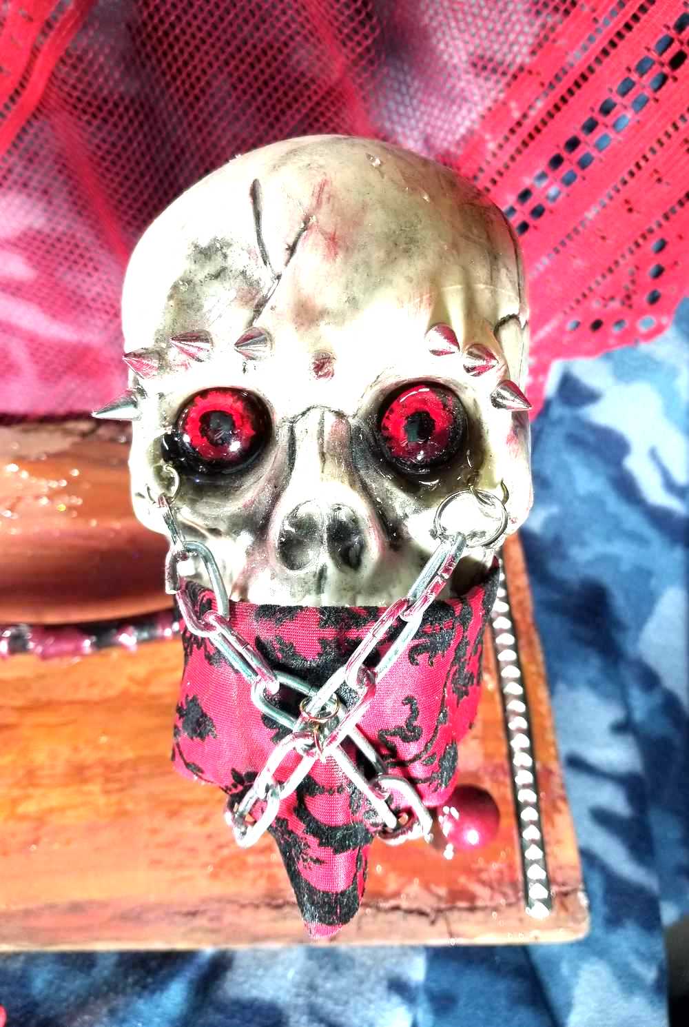 - SEE NO EVIL Boasts a Red and Black Velvet Bandana with Chains, Earrings and lots of Screws to his Head